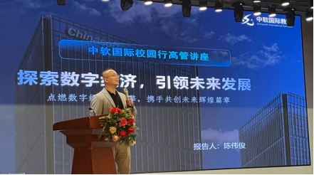 在主题演讲环节,中软国际教育科技集团课程总监陈伟俊带来了题为《探索数字经济,引领未来发展》的演讲。他从数字经济的概念、发展趋势以及对企业和个人的影响等方面进行了深入剖析,为同学们提供了全面的数字经济知识体系。陈总监的演讲生动有趣,引人入胜,赢得了同学们的阵阵掌声。
