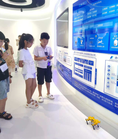 在智能互联网产业学院展厅,人形机器人再次成为全场焦点。这一次,小学生们获得了更充分的互动时间。在老师的专业指导下,孩子们分组操作机器人完成指令。当看到机器人稳健地跨越障碍、灵活转身时,孩子们兴奋地鼓掌欢呼,眼神中充满了对科技的向往。