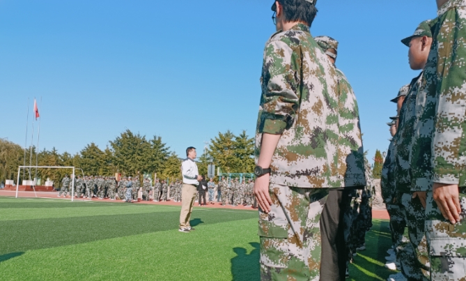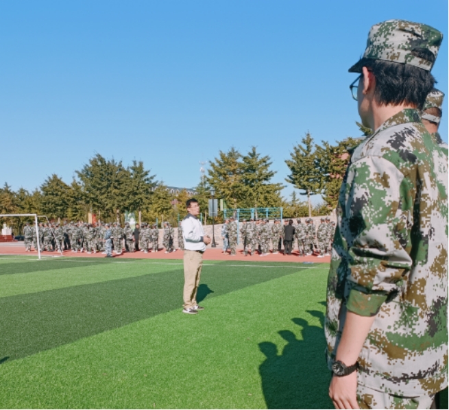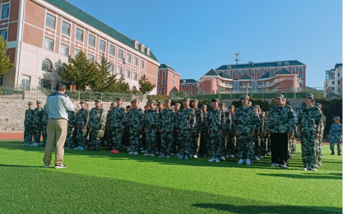 在训练场上,新生们身着统一的迷彩服,队列整齐,口号响亮,展现出了良好的精神风貌和昂扬的斗志。袁院长首先代表学院向全体新生致以热烈的欢迎,他的话语中充满了对新生们未来大学生活的美好祝愿。“同学们,欢迎你们来到大连枫叶职业技术学院,成为智能互联网产业学院这个大家庭的一员。你们的到来,为学院注入了新的活力与希望。”袁院长深情地说。
